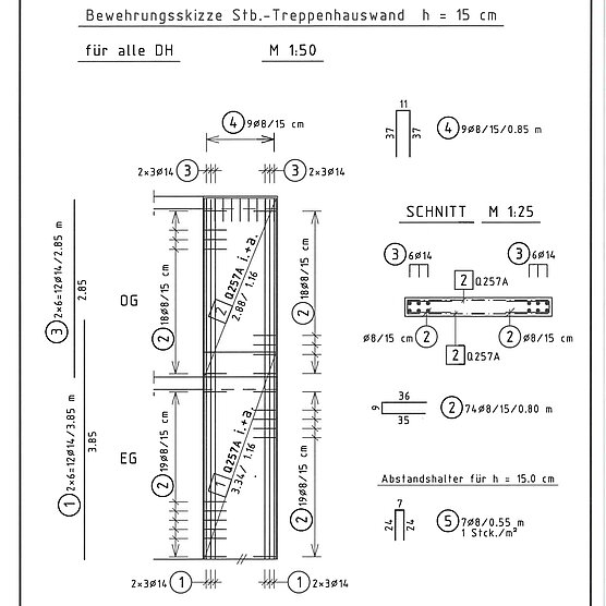 Für die Ausführung des Projekts auf der Baustelle fassen wir die statische Berechnung in Bewehrungsplänen oder -skizzen zusammen. Kommen Fertigteile - zum Beispiel Decken oer Wände - zum Einsatz, werden die Zeichnungen hierfür vom Hersteller zu uns gesandt und von uns auf Übereinstimmung mit der statischen Berechnung kontrolliert.